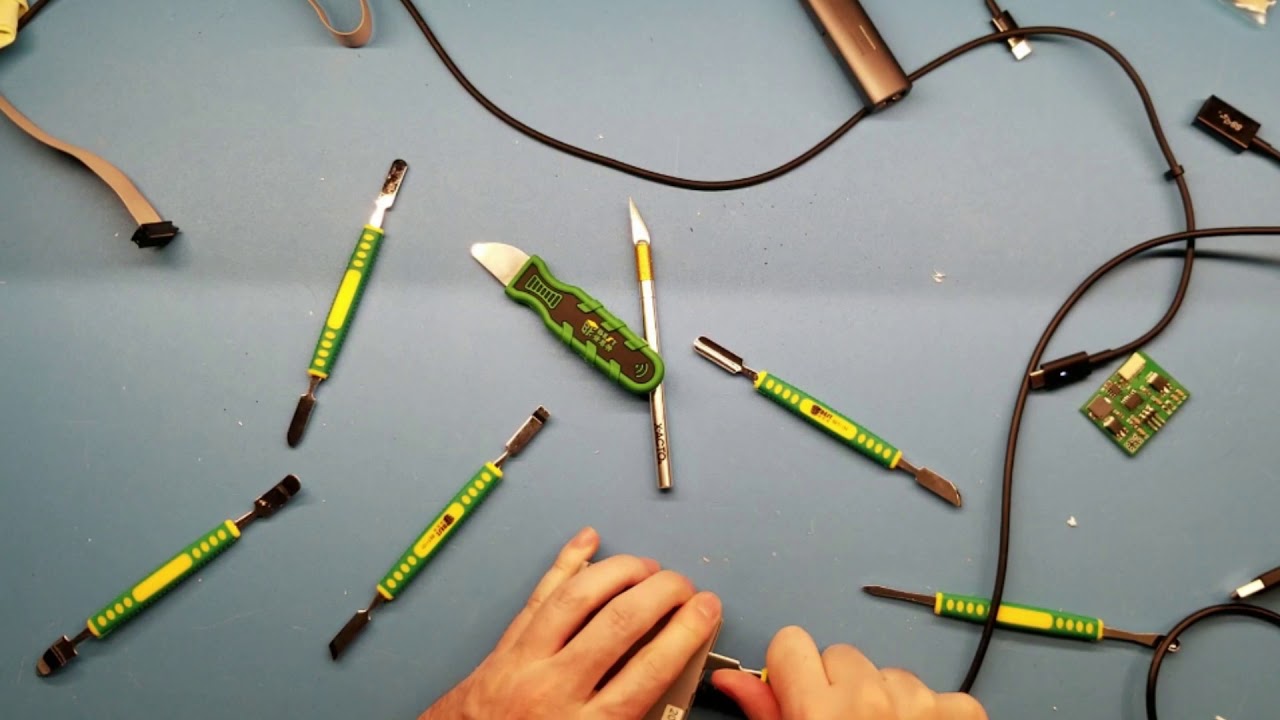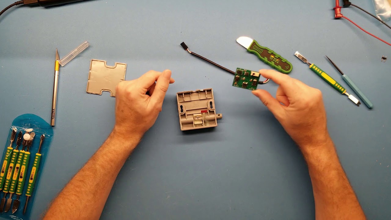 Ich habe das Gehäuse nach einigen Minuten Murksen dann mit zwei kleinen Schraubenziehern, einem Japanmesser und ein paar Gitarren-Plektren aufgekriegt. Richtiges Werkzeug (zB so ein China-Smartphone-Reparatur-Kit) wäre sicher sehr hilfreich dafür. Passt auf, dass ihr die Elektronik nicht nicht beschädigt beim Öffnen. Ich hätte fast versehentlich das Flachbandkabel der Knöpfe vorne kaputtgemacht…