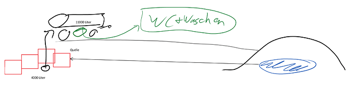 Zwischen den roten Tanks und dem schwarzen Anhänger soll zudem Trinkwasser abgezweigt werden, so dass man evt. um die untere Pumpe zu entlasten eine künstliche Trägheit beim Ein- und Ausschalten machen könnte/sollte.